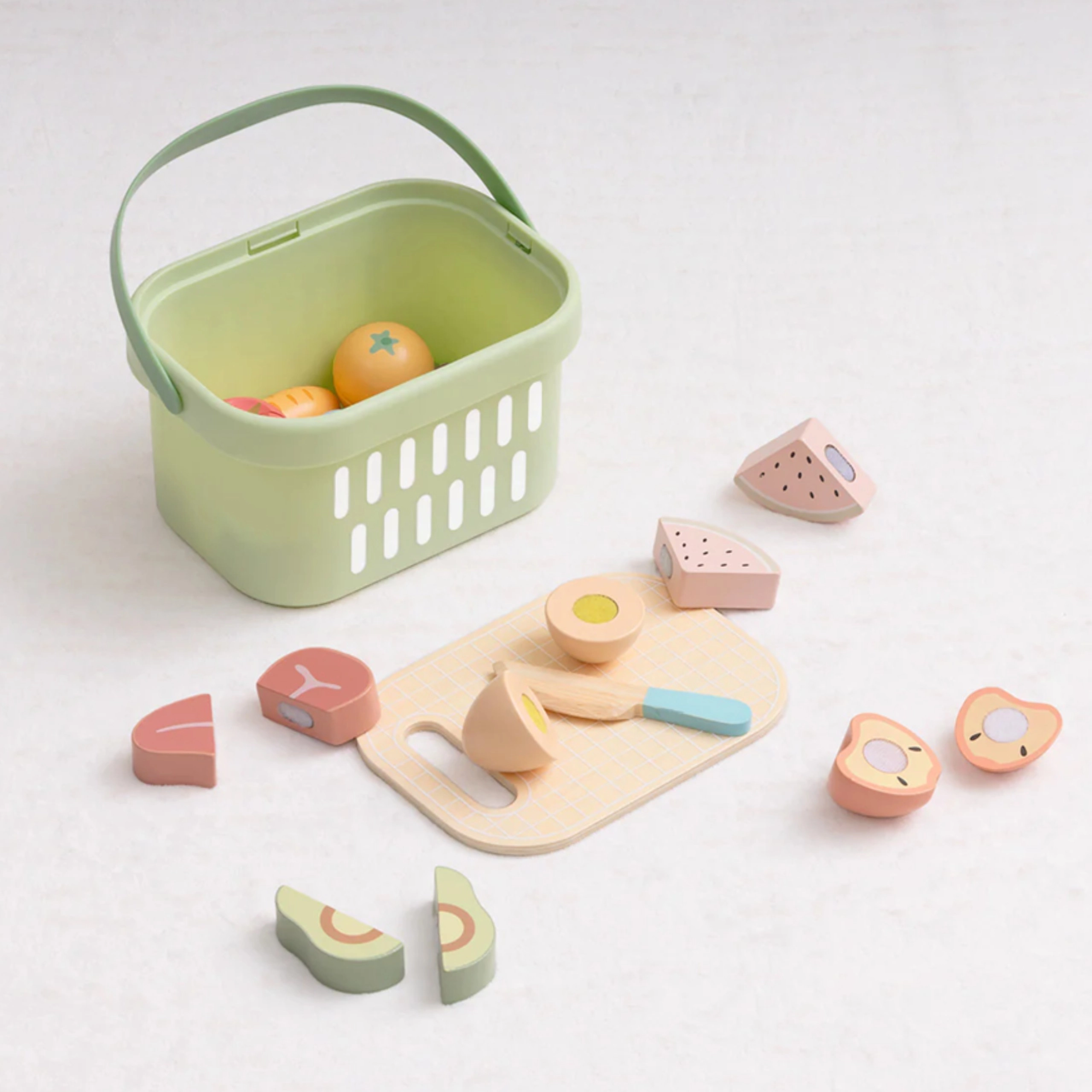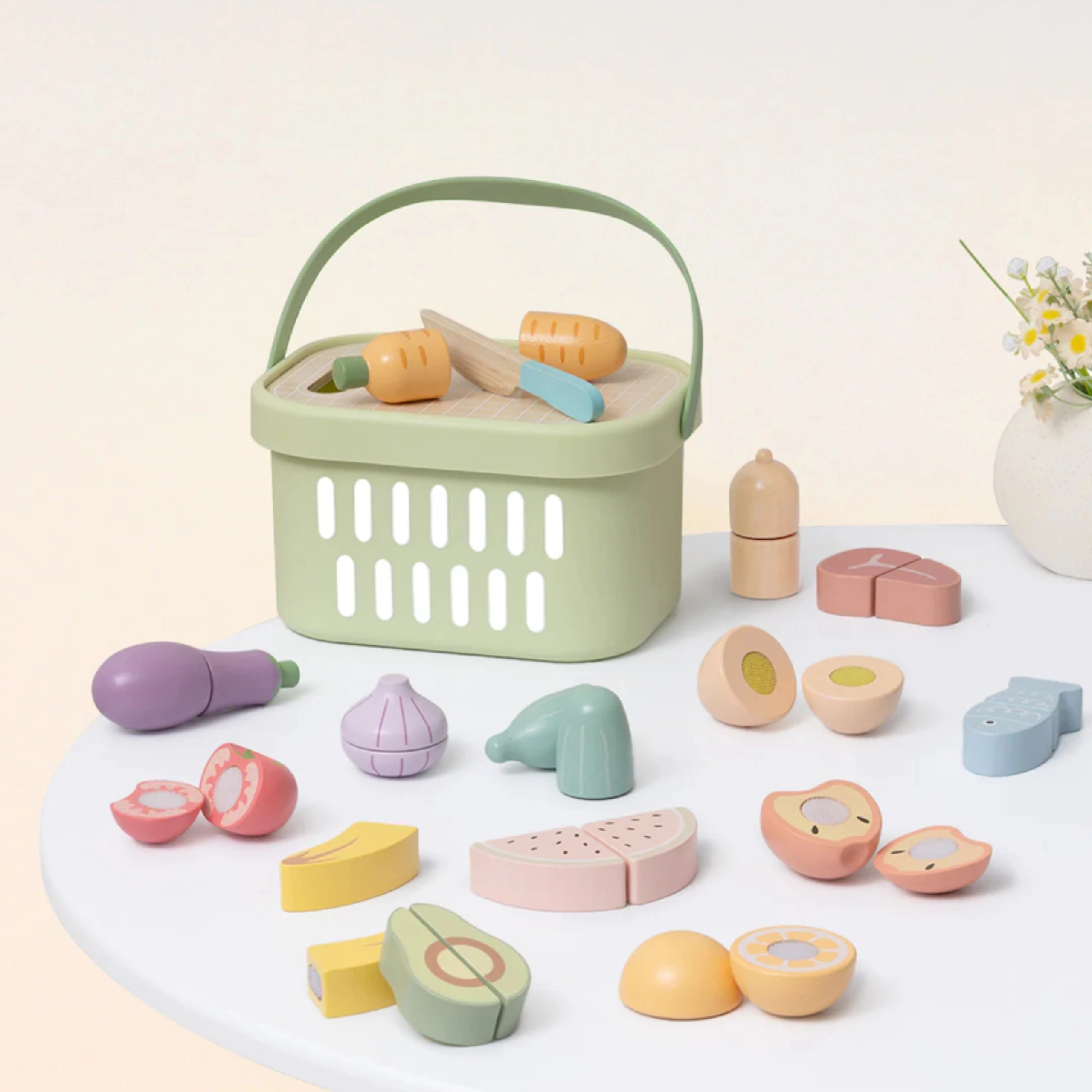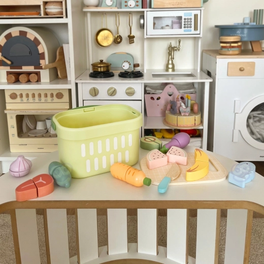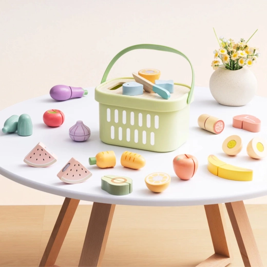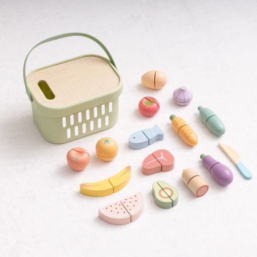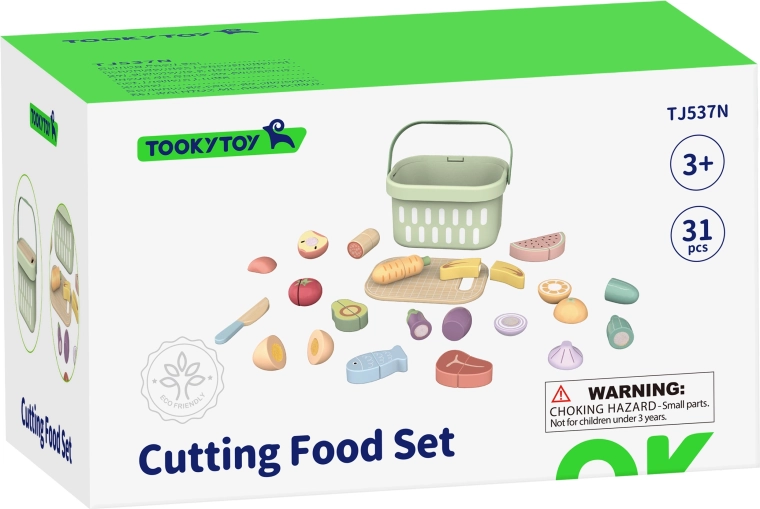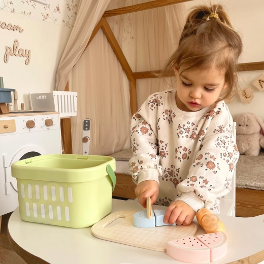 Leseni komplet živil TOOKY TOY je idealen za majhno domačo kuhinjico. Pastelno obarvano sadje in zelenjava, riba, zrezek, sir in jajce so razdeljeni na dele in povezani z ježkom – otroci jih lahko varno “režejo” z lesenim nožem na priloženi deski in ponovno sestavljajo. Vse pospravijo v lahko košaro, zato je komplet enostavno prenosljiv in vedno urejen.