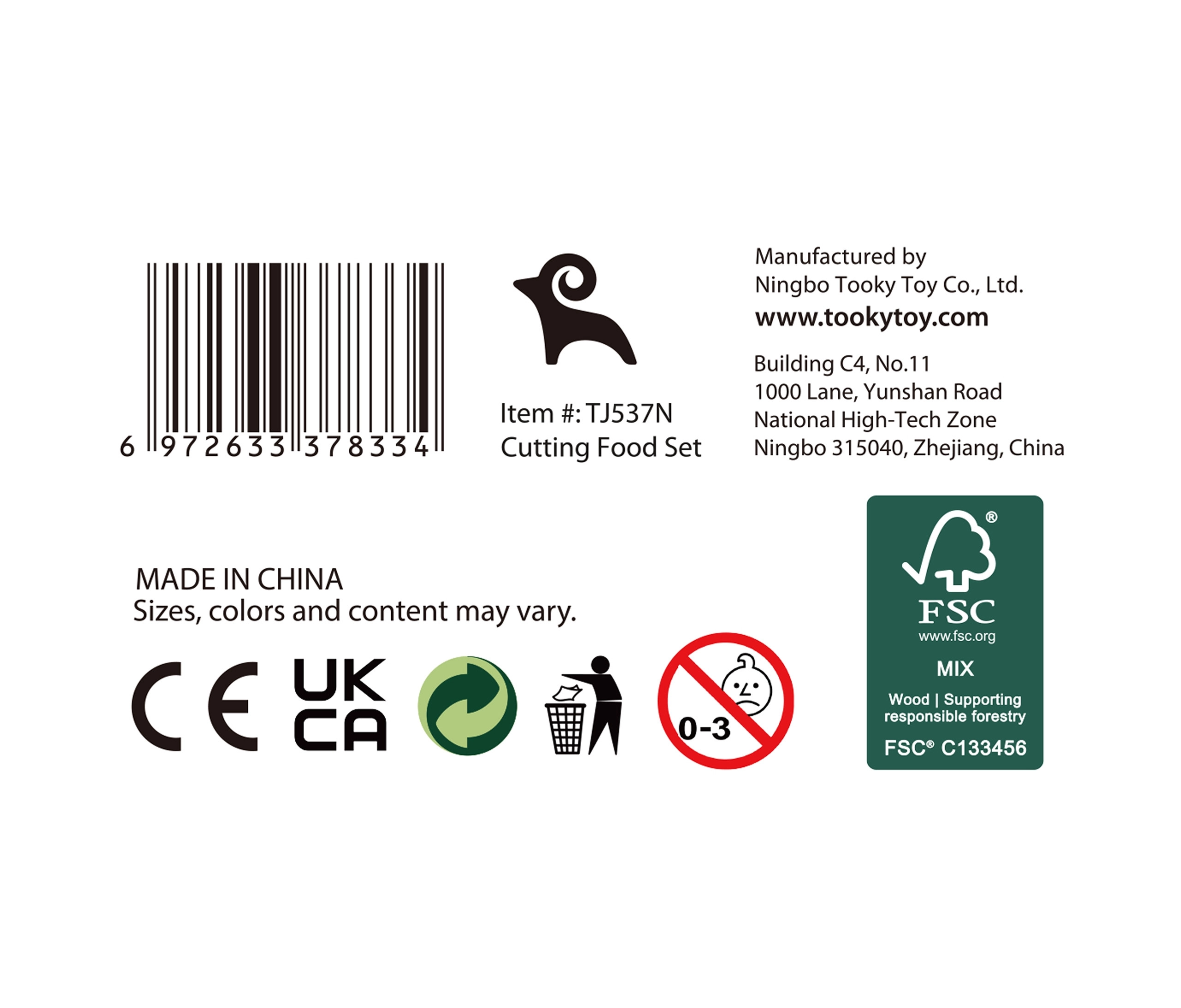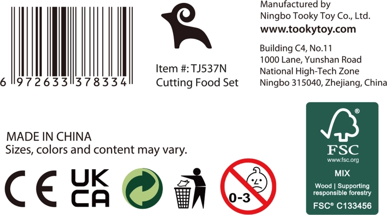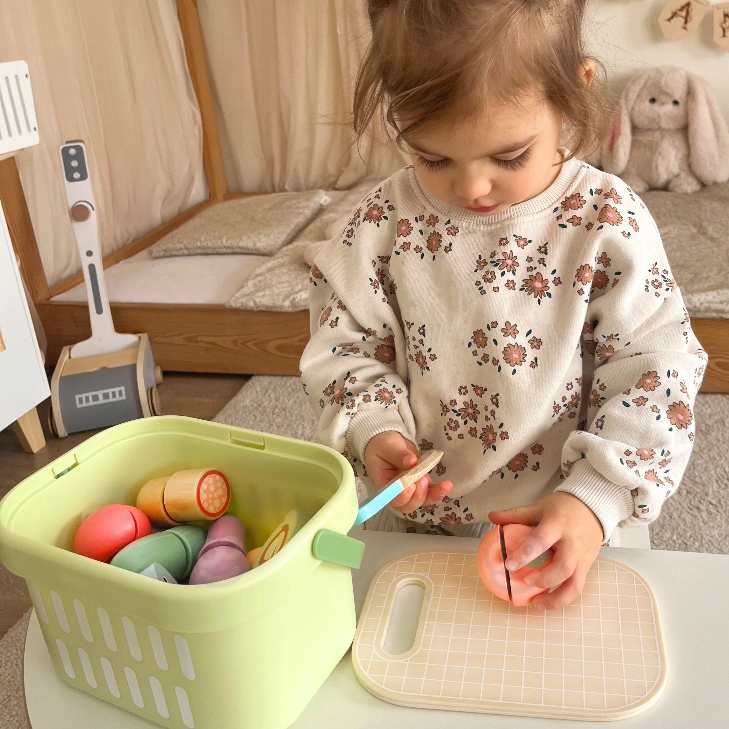 Leseni komplet živil TOOKY TOY je idealen za majhno domačo kuhinjico. Pastelno obarvano sadje in zelenjava, riba, zrezek, sir in jajce so razdeljeni na dele in povezani z ježkom – otroci jih lahko varno “režejo” z lesenim nožem na priloženi deski in ponovno sestavljajo. Vse pospravijo v lahko košaro, zato je komplet enostavno prenosljiv in vedno urejen.
