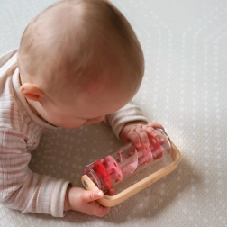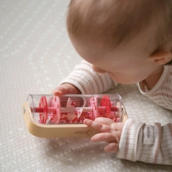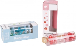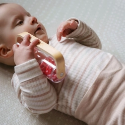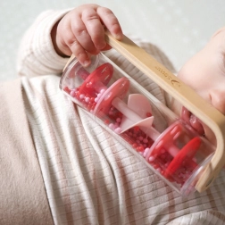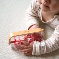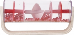 Ta rdeča dežna palica združuje naraven les in prozorno ohišje, polno kroglic, ki se pri gibanju gladko pretakajo in ustvarjajo relaksacijski, ritmičen zvok. Otroci lahko igračo tresejo, obračajo za 360° ter opazujejo, kako se perlice pomikajo z vrha navzdol – odličen dražljaj za vid, sluh in fino motoriko.