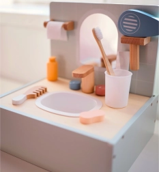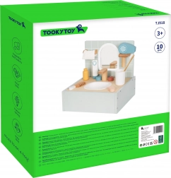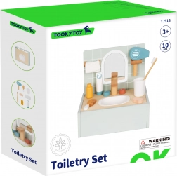 Lesena kopalnica Tooky Toy je idealna za otroke od 3 let naprej. Vsebuje različne kopalniške dodatke, zasnovane tako, da otroke spodbujajo k učenju pomembnih higienskih navad. Set vključuje: