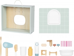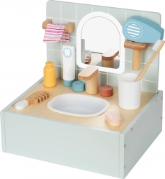 Spremenite vsakodnevne higienske rituale v ustvarjalno zabavo z leseno kopalnico Tooky Toy. Ta prikupen mini set vsebuje vse potrebno za igro prizorov v kopalnici, vključno z zrcalom, ponarejenim umivalnikom s pipo in realističnimi dodatki.