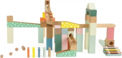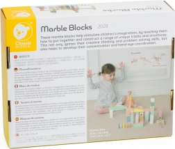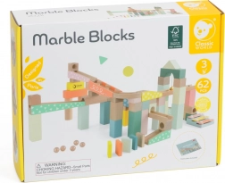 Leseni komplet za gradnjo kroglične steze znamke Classic World je primeren za otroke od 3 let dalje. Igrača vsebuje 62 kosov različno oblikovanih in velikih blokov, ki ponujajo neskončne možnosti za gradnjo ustvarjalnih stez. Pastelne barve in nestrupeni premazi zagotavljajo varnost ter estetski videz igrače.