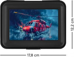 Dizajn te škatle združuje preprostost in funkcionalnost. Glavna slika helikopterja na pokrovu doda izdeku zabavno estetiko, zato bodo vaši najmlajši z veseljem nosili kosila v šolo ali na izlete. Poleg tega je odlična izbira za vse navdušence nad letali.