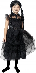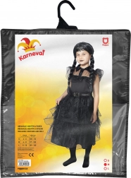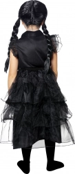 Spremenite malo zvezdo zabave v skrivnostno damo. Črna, večplastna obleka z nežnimi volančki in dekorativnim pasom ustvari eleganten gotiški videz, ki izstopa na vsaki zabavi, karnevalu ali šolskem pustovanju.