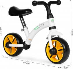 Poganjalec ECOTOYS je odlična izbira za prve korake k samostojni vožnji. Zaradi majhne teže in pametne zasnove otroci naravno urijo ravnotežje, koordinacijo in samozavest, kar olajša prehod na klasično kolo. Praškasto barvan jeklen okvir zagotavlja dolgo življenjsko dobo in sodoben videz, EVA kolesa so tiha, trpežna in ne potrebujejo pumpanja.