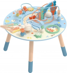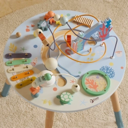 Lesena aktivnostna mizica Morsko življenje je odličen uvod v svet oblik in barv. Varna za najmlajše, izdelana iz kakovostnega lesa in barvana z nestrupenimi barvami. Otroke spodbuja k igri stoje, kar podpira njihovo koordinacijo in ravnotežje. Izobraževalne koristi te mizice so izjemne, bodisi pri izboljšanju fine motorike ali razvoju glasbenih veščin.