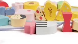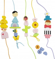 Kreativni leseni set za nizanje s 73 deli razvija fino motoriko, potrpežljivost in domišljijo. Otroci lahko nizajo barvne perle, kombinirajo oblike in barve ter sestavljajo likom prava oblačila ali stebla k cvetovom. Varni les in netoksične barve zagotavljajo brezskrbno igro od 3. leta naprej.