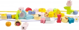 Raznolike perle v obliki cvetov, živalic in geometrijskih oblik spodbujajo otroke k nizanju, razvrščanju in ustvarjanju lastnih vzorcev.