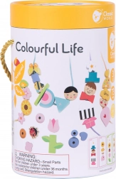 Kakovostni leseni deli z netoksičnimi barvami so shranjeni v praktični škatli s pokrovom, ki olajša pospravljanje in prenašanje.