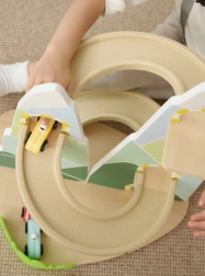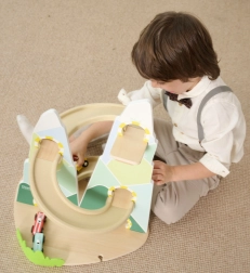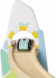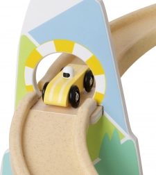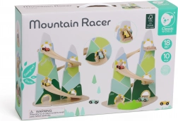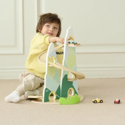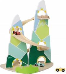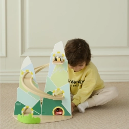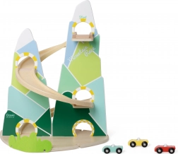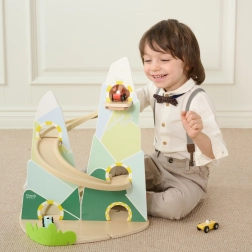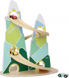 Ta izvirna gorska dirkalna steza z obliko dveh vrhov je izdelana iz kakovostnega lesa in prelakirana z netoksičnimi barvami v prijetnih pastelnih odtenkih. Otroci od 18 mesecev lahko spuščajo 3 priložene avtomobilčke po vijugastih progah, opazujejo vožnjo, se učijo barv in vadijo pozornost.