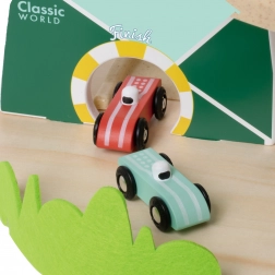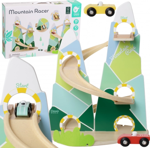 Odkrijte zabavno leseno dirkalno stezo, navdihnjeno z gorami, znamke CLASSIC WORLD. Stilske pastelne barve, varna izvedba brez ostrih robov in 3 barvni avtomobilčki obljubljajo ure zabave. Igra razvija fino motoriko, koordinacijske sposobnosti ter spodbuja logično razmišljanje in zdravo tekmovalnost.