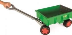 Prikolica iz serije Gigant je odličen pomočnik za vsakodnevno igro. Zahvaljujoč čvrsti konstrukciji in visoki nosilnosti lahko otroci zlahka prevažajo igrače, pesek ali listje. Odpirajoča se loputa omogoča udobno nakladanje in razkladanje, priložen ročaj pa jo spremeni v idealen voziček za vleko.