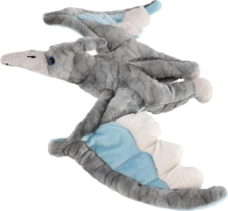 Ta nežen pterozaver navduši z razpetimi krili v sivi barvi z modrimi in svetlimi detajli. Je prijetno puhast, lahek in odlično sede v male ročice. Zaradi prijaznih materialov je primeren kot prvi pliškotek in bo hitro postal najljubši prijatelj za spanje in na poti.