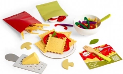 S tem vsestranskim kompletom se bodo otroci prelevili v male kuharske mojstre in pripravili svoj krožnik testenin. Barvite, mehke filcane sestavine, kot so tagliatelle, ravioli in farfalle, dopolnjujejo paradižnikova omaka, gobe, listi bazilike ter lesena skleda, krožnik, dvoje vilic in ribežen s kosom parmezana – vse za realistično kuhinjsko zabavo.