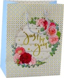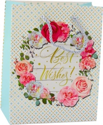 Darilna vrečka z romantičnim cvetličnim vzorcem in zlatim napisom "Best Wishes" za posebne priložnosti.