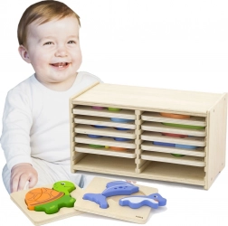 Naloga otroka je pravilno namestiti barvne koščke sestavljanke na ustrezno ploščo. Preproste oblike, lepe ilustracije in privlačne barve pritegnejo pozornost otrok ter jim pomagajo razvijati spretnosti sestavljanja. Del seta je tudi lesen stojalo za shranjevanje plošč.