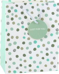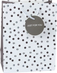 Darilna vrečka s pikami je idealna rešitev za zavijanje daril za vsako priložnost. Izdelana je iz kakovostnega okrasnega kartona z nežnim vzorcem pik v odtenkih srebrne, zelene in črne, kar prinaša moderen in stilski videz. Primerna je za rojstne dni, obletnice in druge praznične dogodke.