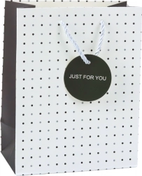 Na sprednji strani vsake vrečke je dekorativna visečka z napisom 'Just For You', kar poudari edinstvenost darila in celotnemu videzu doda eleganco. Močni vrvni ročaji v barvi, usklajeni z motivom, zagotavljajo udobno prenašanje.