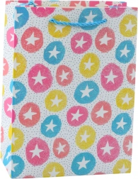 Ta darilna vrečka je izdelana iz trpežnega okrasnega kartona, ki zagotavlja njeno obstojnost in estetski videz. Motivi z barvitimi srčki, zvezdicami, pikicami in črtami vrečki dodajo lahkoten in zabaven značaj, ki odlično pristaja različnim vrstam daril. Močni vrvni ročaji v ujemajoči se barvi omogočajo udobno prenašanje.