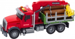 Ta rdeči gozdarski tovornjak je pripravljen na nakladanje in prevoz lesa. Zadnja prikolica z gibljivim žerjavom in prijemalom omogoča enostavno dvigovanje in premikanje hlodov, ki so del kompleta. Upravljanje roke žerjava poteka z gumbi na vozilu, zato bodo otroci uživali v realistični in varni igri.