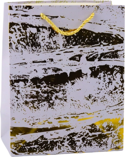 Ta elegantna in brezčasna darilna vrečka v srebrni barvi z nepravilnim zlatim vzorcem je stilska embalaža, ki sama po sebi pritegne pozornost in poudari izjemen značaj darila. Zlati poudarki se čudovito svetijo pod svetlobo, kar vrečki daje luksuzen in sodoben videz, ki bo zagotovo očaral obdarovanca.