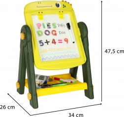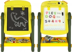 Ta obojestranska izobraževalna tabla je idealno orodje za razvoj ustvarjalnosti in učenja pri otrocih. Na eni strani je magnetna bela površina, ki omogoča suhoizbrisno risanje in pisanje s flomastri, medtem ko druga stran služi kot klasična črna tabla za risanje s kredo. Okrašena z veselim dinozavrskim motivom bo ta tabla očarala vsakega otroka s svojo barvitostjo in možnostmi uporabe.