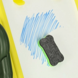 Ena stran je za pisanje s flomastri, druga pa za risanje s kredo, kar ponuja več možnosti za ustvarjalnost.