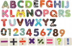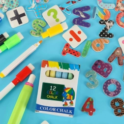 V kompletu so različni učni pripomočki, kot so magnetne črke, številke, krede in flomastri.