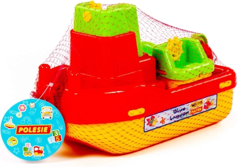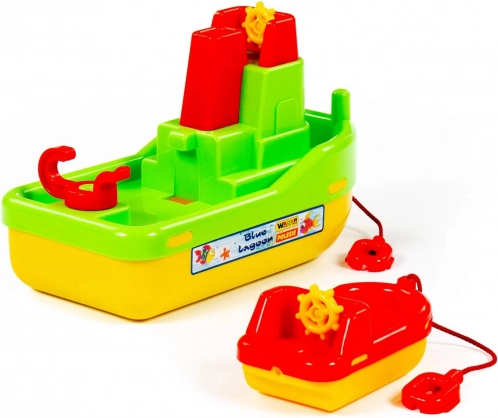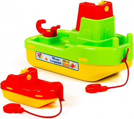 Vlačilec je opremljen s kavljem in vrvjo, s katerima lahko otroci preprosto priključijo in vlečejo manjšo ladjico – kot na pravi vodi.
