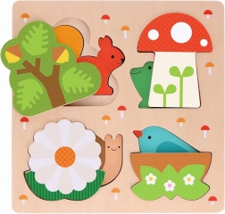 Odkrijte čar narave z vstavljanko Petit Collage, ki bo navdušila vaše otroke. Ta večplastna, osemdelna sestavljanka predstavlja domove priljubljenih živali, kot so žabice, ptice, veverice in polži. Razporedite vsak košček in poiščite pravo mesto za vsak živalski dom.