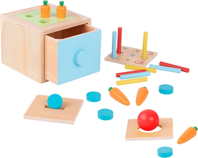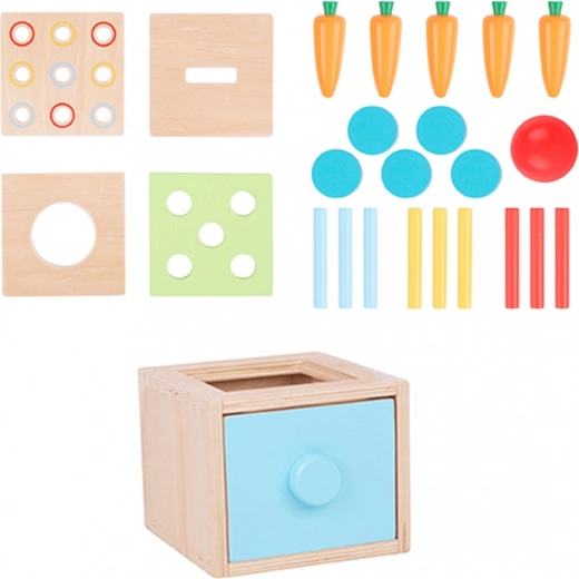 Temelji na principu vstavljanja predmetov v pravilne odprtine. Preprosta, a poučna zabava, pri kateri otroci doživljajo veselje in izzive. Set vključuje štiri stopnje težavnosti: