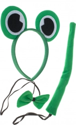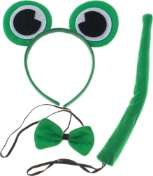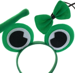 Prisrčen komplet za male žabice vsebuje zelen naglavni trak z izrazitimi očmi, ujemajoči se metuljček in rep. Odlično za pust, maškarado, noč čarovnic in igro doma. Mehki materiali, univerzalna velikost in čvrsto utrjene oči poskrbijo za udobje in super videz skozi ves dan.