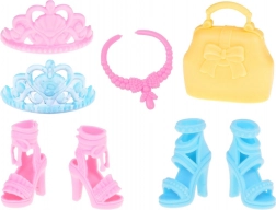 Dva elegantna para čevljev s peto dodata celotnemu videzu šarm in stil. Dodatki, kot so učinkovita torbica, rožnata ogrlica in dve kroni, so popolni za vsako malo princeso.