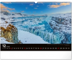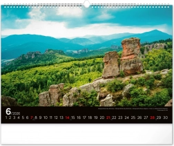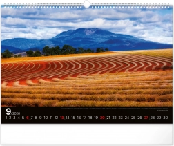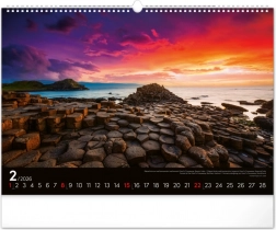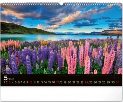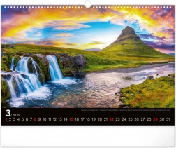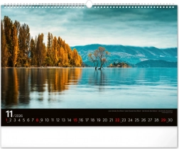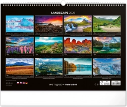 Dvanajst pisano obarvanih naravnih prizorov iz celega sveta v zidnem koledarju za leto 2026.