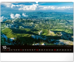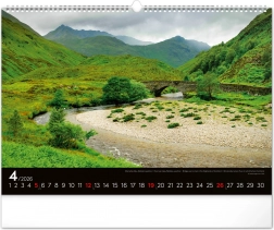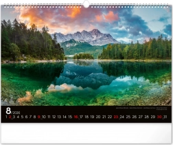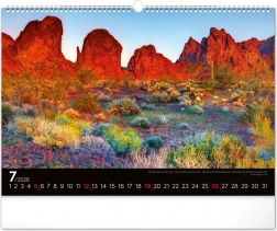 Odkrijte lepoto narave vsak mesec s tem koledarjem, ki ponuja romantične posnetke gorskih dolin, nižin, vodnih površin in puščav. Vključuje preprosto koledarsko tabelo, ki je umeščena na stilsko črno ozadje.