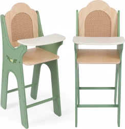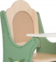 Lesen stolček za punčke v vintage slogu z ratanastim naslonom! Eleganten stolček doda pristnost pri igri skrbi za punčke. V zelenih tonih in z nežnimi cvetličnimi detajli je ta izdelek popoln dodatek vsaki otroški igri.