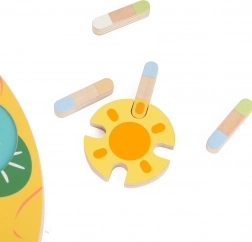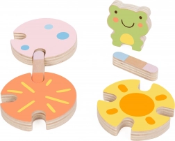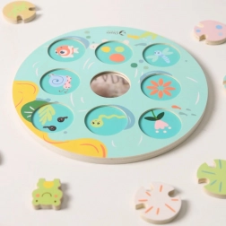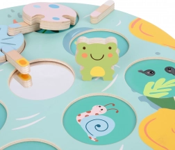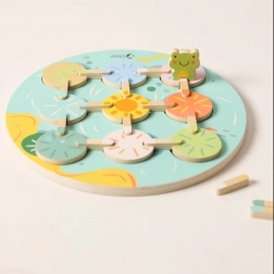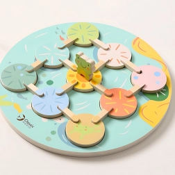 Barvita lesena žabica in nežni pastelni odtenki igri dodajo estetsko vrednost ter podpirajo prepoznavanje barv.