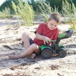 Ta podrobno izdelan traktor s prikolico je idealen za igro v peskovniku, na vrtu ali doma. Funkcionalni čelni nakladač omogoča preprosto zajemanje peska ali drobnega materiala, prikolica s prekucno keso pa poskrbi za udoben prevoz in raztovarjanje tovora. Velika, profilirana kolesa in 6 mm kovinske osi koles zagotavljajo stabilnost in vzdržljivost tudi pri intenzivni igri.