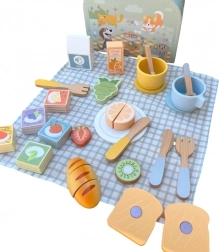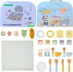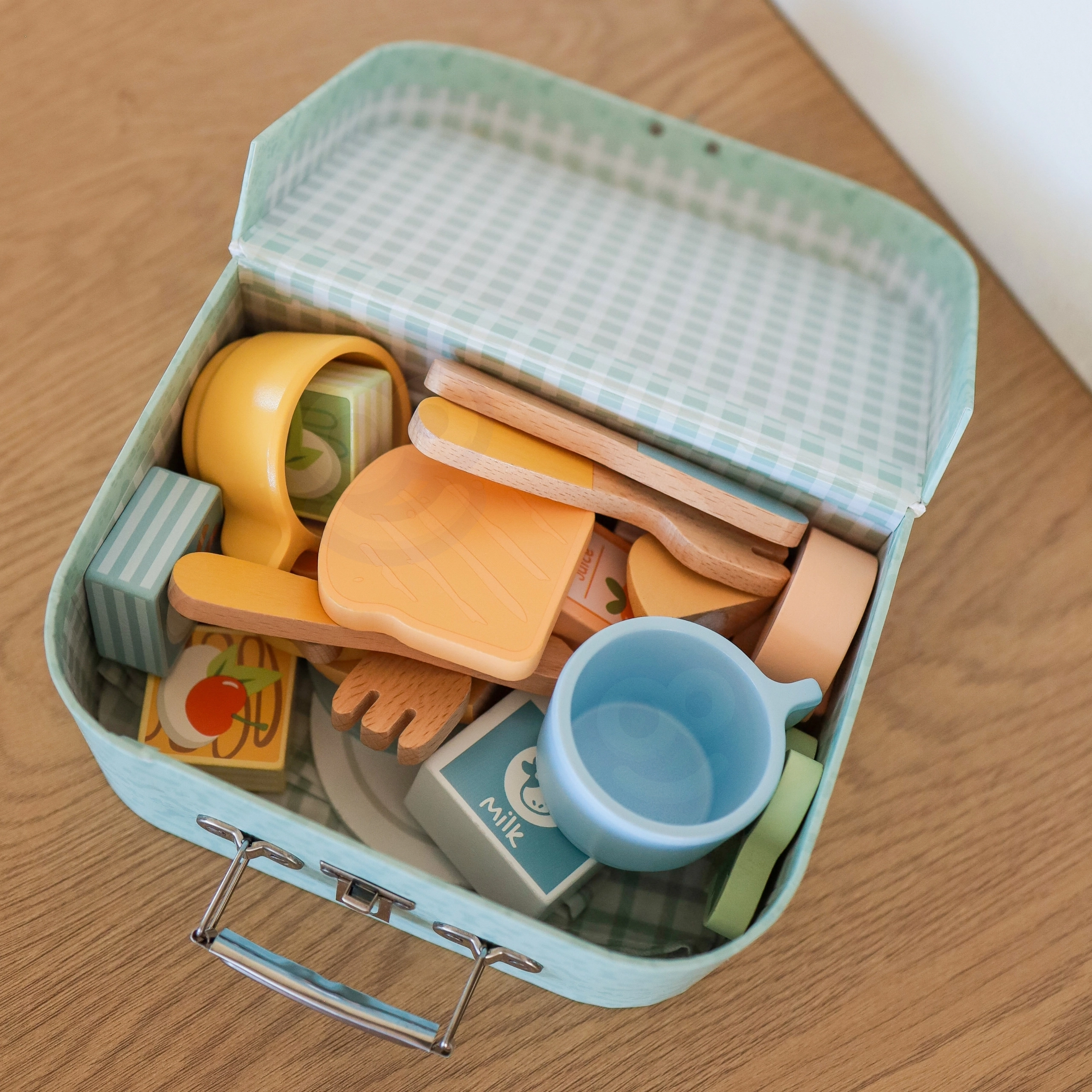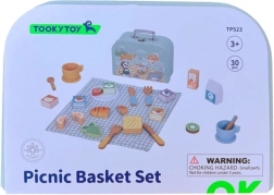 Leseni piknik set TOOKY TOY v ljubkem turkiznem kovčku prinaša otrokom realistično zabavo pri pripravi in serviranju hrane. Pisano sadje in pecivo je mogoče »rezati« in ponovno sestavljati, ne manjkajo krožnički, pribor, skodelice ter kartončki mleka in soka. Igra razvija fino motoriko, koordinacijo oko–roka ter jezikovne veščine skozi naravno igro vlog.