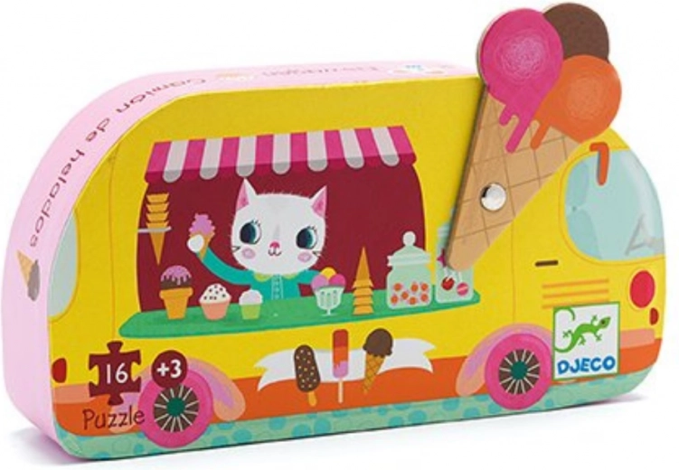 Odkrijte otroško sestavljanko DJECO Sladoled se pelje, ki je idealna za majhne ljubitelje zabave in učenja. Ta sestavljanka s 16 koščki prinaša: