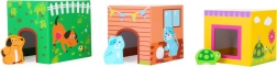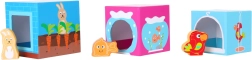 Šest prikupnih lesenih živali spada v ustrezne odprtine v kockah. Otroci vadijo razvrščanje, ujemanje in domišljijsko igro.