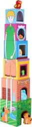 Ta čudovit sestavljivi stolp iz trpežnih kartonskih kock in lesenih živali uči otroke razvrščati velikosti, presojati prostor in uriti spretnost. Kocke postavite od največje do najmanjše v stabilen stolp visok do približno 58 cm, zahvaljujoč odprtinam v kockah pa vanje otroci vstavljajo ustrezne živali.