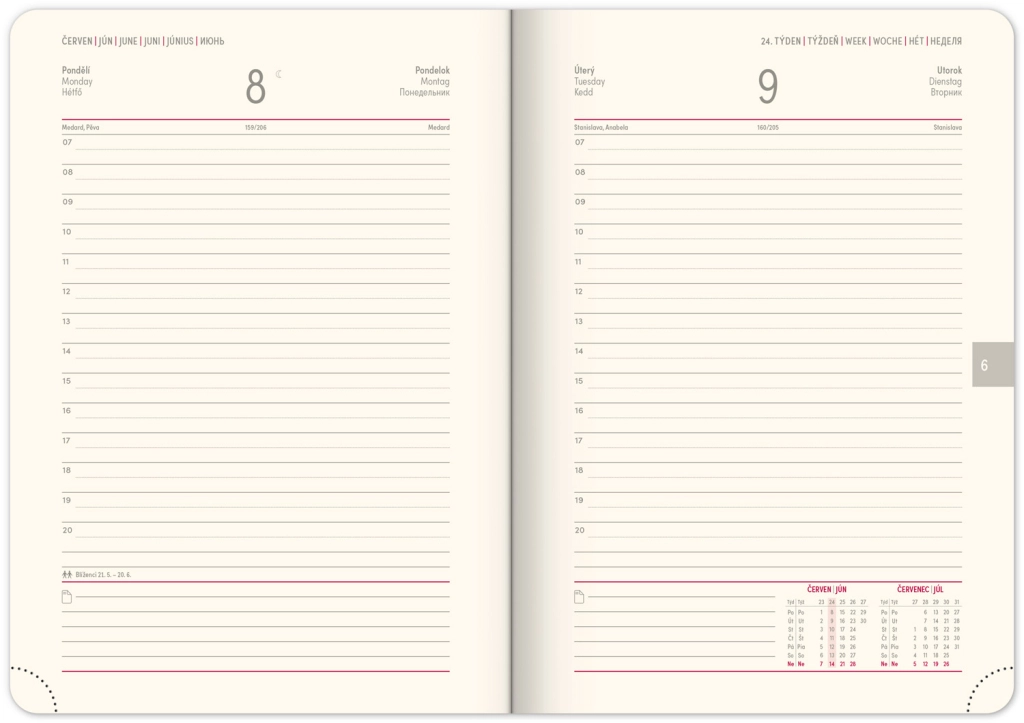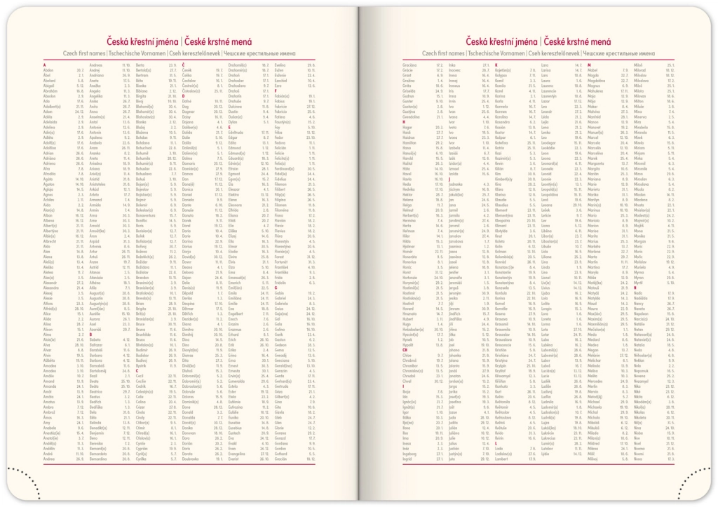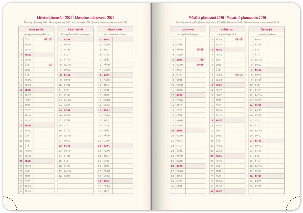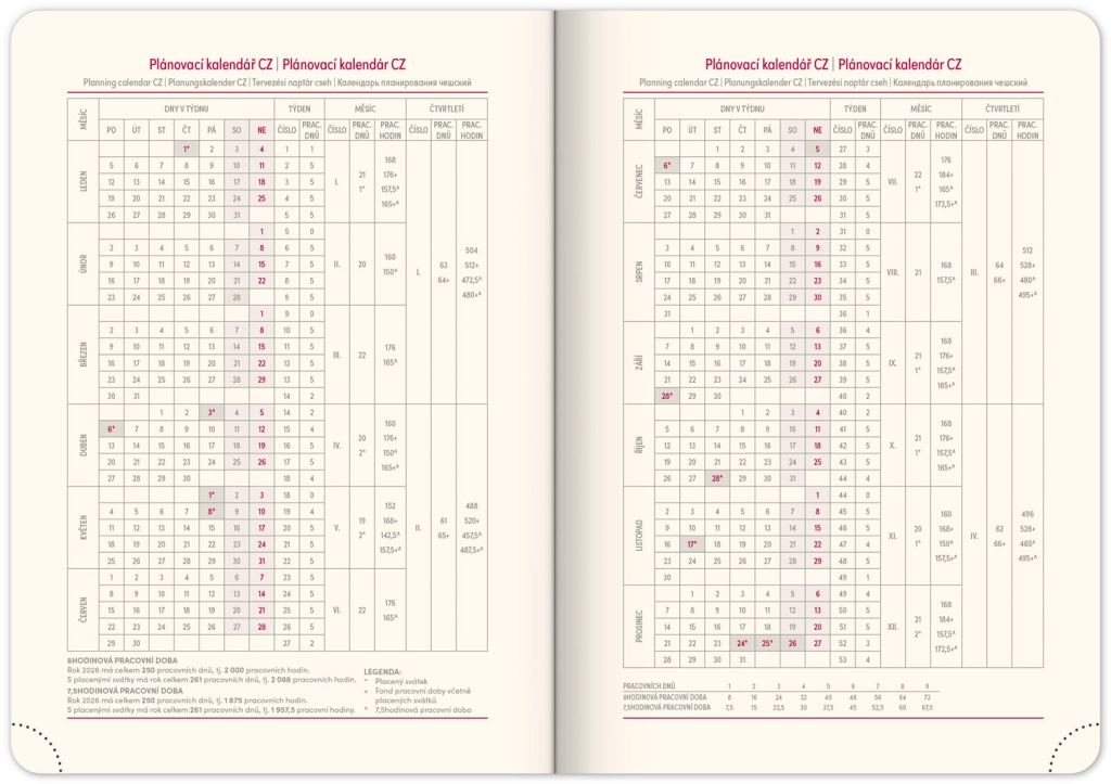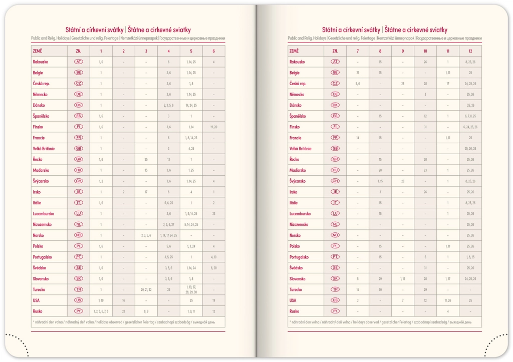 - Dnevni razpored s česko-slovaškim koledarjem in dodatnimi jeziki kot angleščina, nemščina, madžarščina in ruščina
