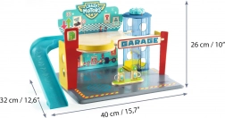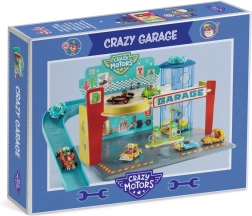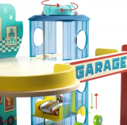 Lesena garaža Djeco je ilustrirana igrača, ki se odlično poda v svet Crazy Motors. Vsebuje enostavno upravljano dvigalo, odstranljive dodatke in ponuja zabavne možnosti parkiranja.