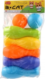 Kegljčki in žogice so v živahnih barvah, kot so oranžna, zelena, rumena in modra, kar jih naredi za privlačno igračo za otroke.