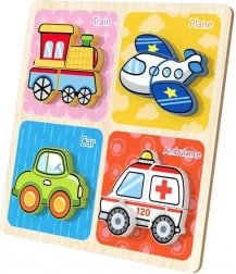 Lesene sestavljanke velikosti 30 x 30 cm vsebujejo slike štirih različnih prometnih sredstev, ki igri dodajo privlačnost in izobraževalno vrednost. Otroci se s temi sestavljankami ne le igrajo, temveč tudi urijo svoje finomotorične sposobnosti in logično razmišljanje, kar je idealno za otroke od 3. leta starosti.