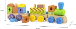 Ta kakovosten lesen vlakec sestavljajo vagoni z zatiči, na katere otroci zlagajo pisane geometrijske kocke. Združuje zlaganje, vleko in gradnjo, zato spodbuja domišljijo in uri koordinacijo oko–roka. skrbno obdelan les in nestrupene barve zagotavljajo varnost in vzdržljivost pri vsakodnevni igri.