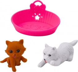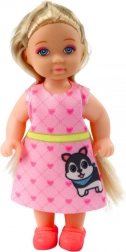 Mini punčka s psom in mačko z dodatki je idealna za male skrbnike. Punčka, visoka 12 cm, oblečena v rožnato obleko z okrasnimi srčki, jo spremljajo plastične figurice živalic. Komplet vsebuje: