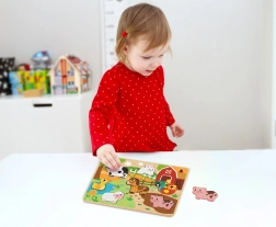 Potopite se v čudovit in miren dan na kmetiji z našo vstavljanko. Izdelek je sestavljen iz osnovne plošče in sedmih odstranljivih kosov, kar otrokom omogoča vadbo čutnih spretnosti in fine motorike. Otroci se naučijo potrpežljivosti medtem ko odkrivajo raznolikost živalskih prijateljev.