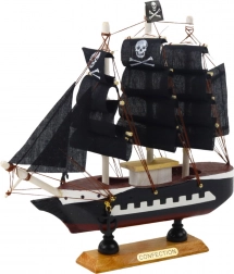 Ta pomanjšan model piratske ladje je izdelan iz lesa in ročno dodelan z poudarkom na simetriji, proporcih in realističnih detajlih, kot so ograjno in jamborno vrvovje, okrašen krmni del ter lobanja na jamboru. Postavljen je na stabilno osnovo z opisno ploščico, kar ga naredi idealno dekoracijo za knjižnico, pisarno ali domačo zbirko. Zaradi svoje kompaktne velikosti ga lahko postavite tudi v omejen prostor, kjer vnaša pridih morske avanture in pritegne pozornost s kontrastnimi barvami.